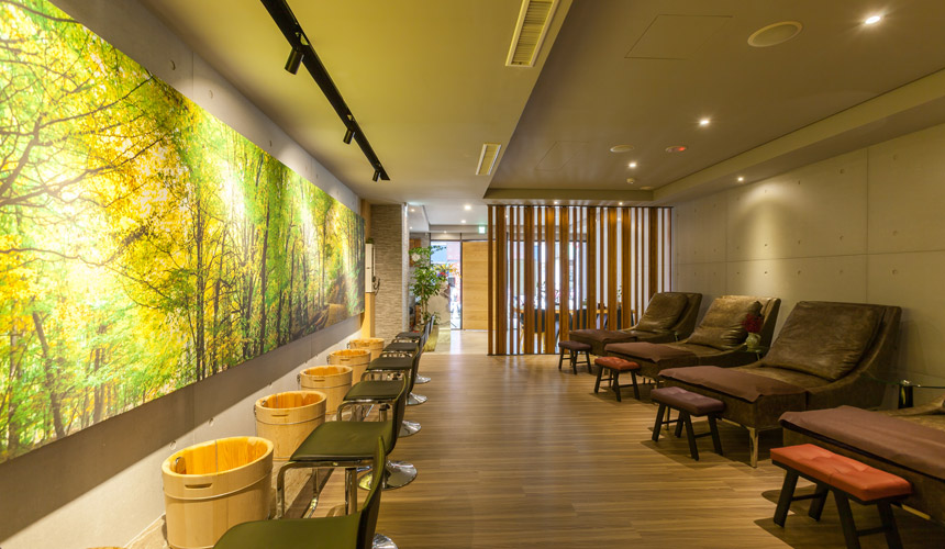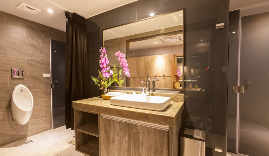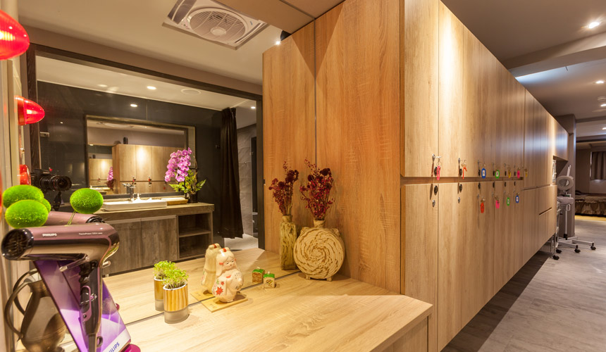 日式簡約裝潢,採日式清水模墻面設計結合檜木,石頭...等 大自然元素自,讓人一進到這空間可以很自然的放鬆心 情,享受空氣中檜木散發出的的芬多精。浴室和廁所皆有分男女,空間隱私安全。